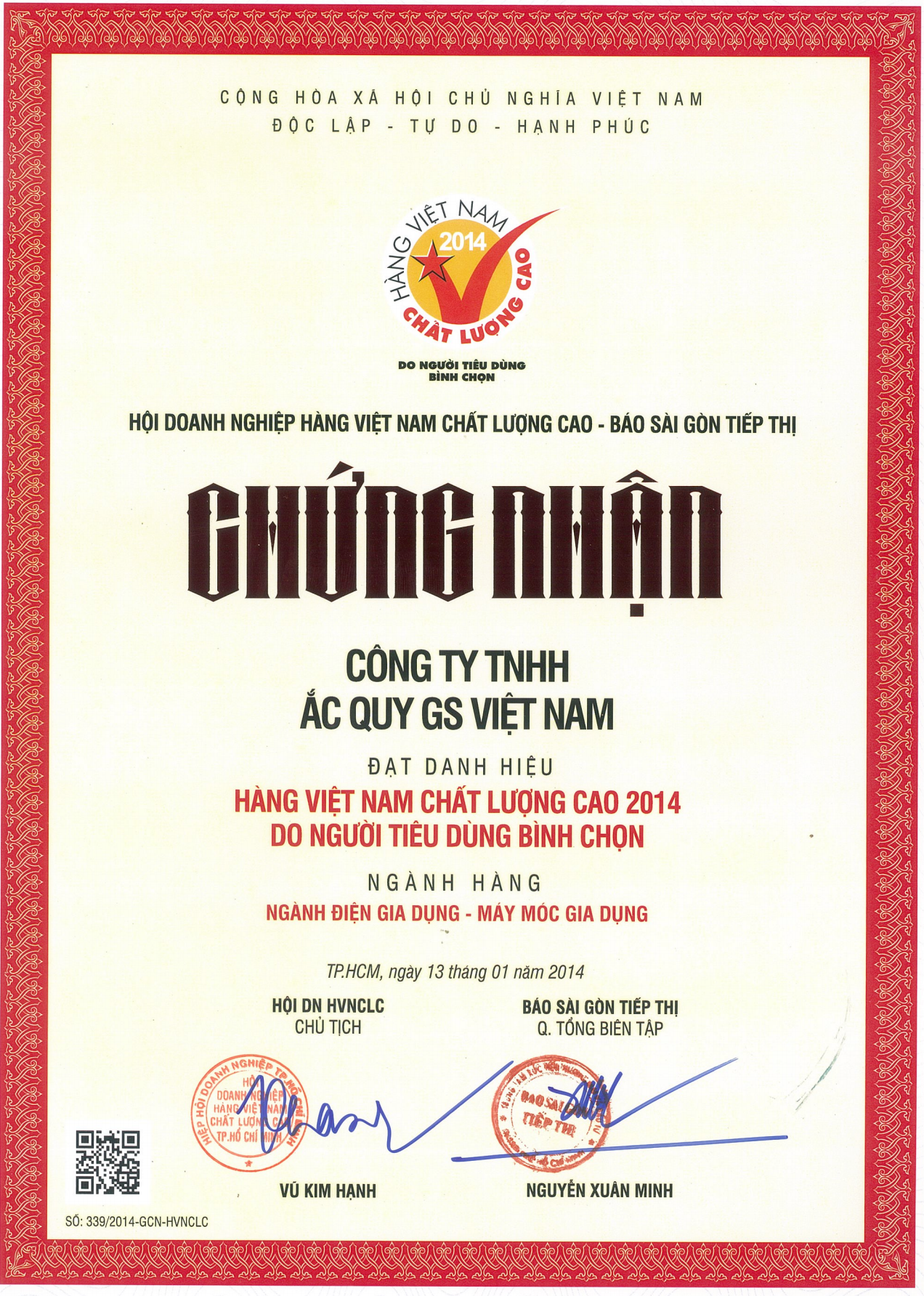Chứng nhận Hàng Việt Nam Chất Lượng Cao, là chứng nhận có uy tín do người tiêu dùng Việt Nam bình chọn. Đây là chứng nhận do Hội Doanh Nghiệp Hàng Việt Nam Chất Lượng Cao phối hợp cùng Báo Sài Gòn Tiếp Thị trao tặng dựa trên kết quả khảo sát hàng năm được thực hiện trên 16000 hộ gia đình và cá nhân tiêu dùng trên 12 tỉnh thành phố khắp cả nước. Đạt được danh hiệu này chứng tỏ các sản phẩm của Công Ty TNHH Ắc Quy GS Việt Nam đã trở thành một sản phẩm chất lượng cao luôn đồng hành trong đời sống hàng ngày của người tiêu dùng Việt Nam, khẳng định sức lan tỏa không ngừng của thương hiệu Ắc Quy GS Việt Nam