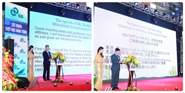 Tại buổi lễ khánh thành, Đại diện các Cổ đông: Ông Masaru Sawada – Giám đốc tập đoàn GS Yuasa, Ông Keichi Kadowaki- Đại diện Cổ đông tập đoàn Mitsubishi kiêm Chủ tịch Hiệp Hội Doanh Nghiệp Nhật Bản JBAH và Đại diện BQL KCN: Ông Bùi Minh Hồng- Trưởng Ban Quản Lý Các KCN tỉnh Vĩnh Phúc đã có bài phát biểu chúc mừng cho sự phát triển thịnh vượng của Công Ty TNHH Ắc Quy GS Việt Nam.